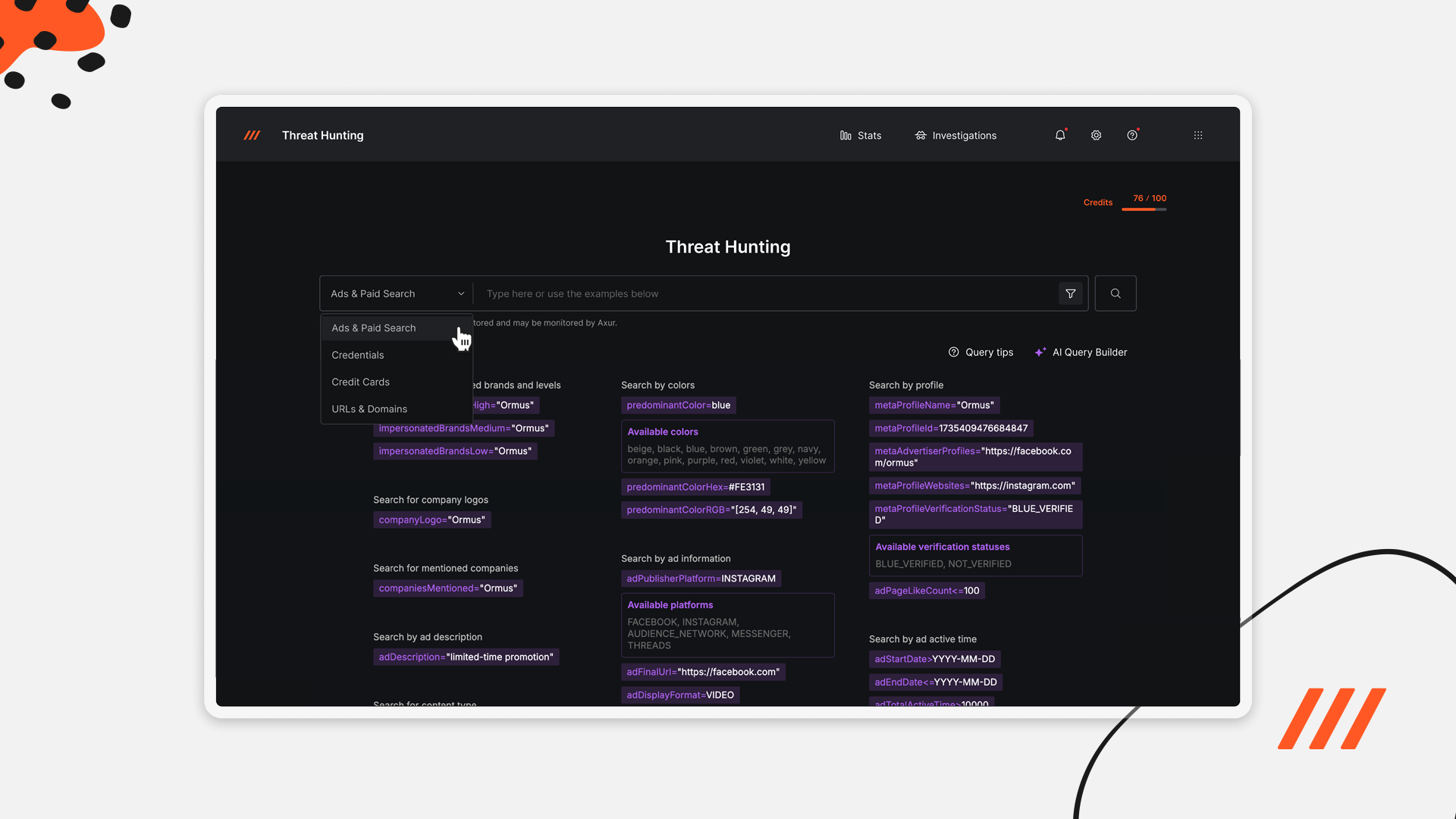 Em essência, nossa solução de Threat Hunting funciona como um mecanismo de busca que permite investigar incidentes envolvendo credenciais expostas, cartões de crédito, URLs e domínios e anúncios e busca paga.